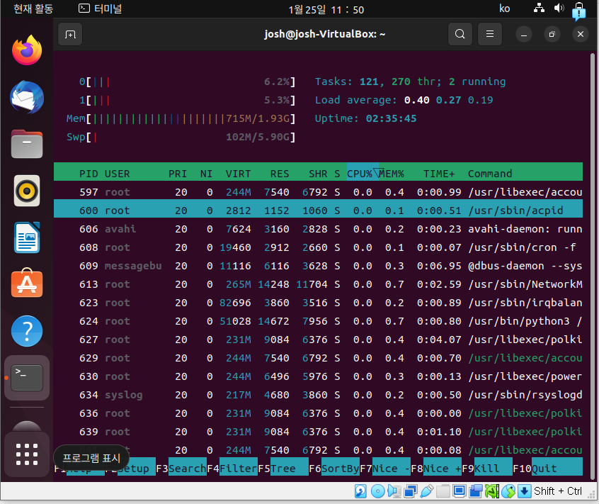 apt-get update는 apt를 이용해 설치할 수 있는 소프트웨어의 목록을 최신상태로 업데이트 하는 방법인데 이는 super user 권한이 필요한 명령어이다. 따라서 sudo apt-get update를 입력하여 명령어를 실행한다. 이렇게 소프트웨어의 목록을 최신상태로 업데이트를 했으면 다음으로 검색을 한다. sudo apt-cache search htop을 입력하면 htop과 관련된 프로그램을 검색해준다. 검색 결과 htop - 대화형 프로세스 뷰어 라고 나오는데 sudo apt-get install htop을 이용해 설치할 수 있다.(만약 어떤 명령어를 쓸지 모르겠으면 sudo apt-get만 입력해 사용설명서를 볼 수 있다) 이제 설치를 완료했으므로 htop을 입력하면 다음과 같이 htop을 사용할 수 있다.