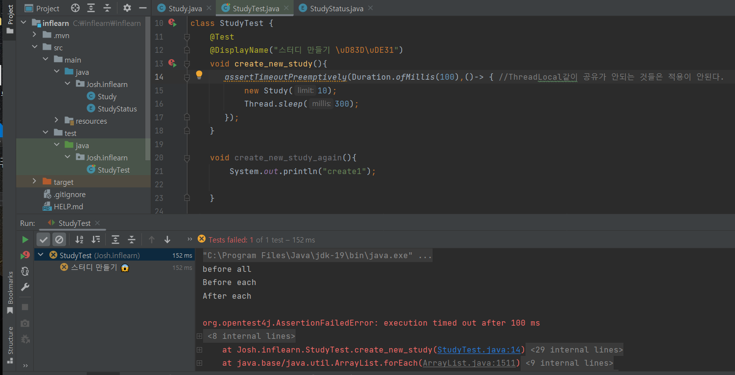 다음과 같이 assertTimeoutPreemptively()를 쓰면 제한시간이 끝날 때까지 람다식 실행이 완료되지 않는 경우 바로 람다식 실행을 끝내고 오류메세지를 출력한다. 백기선 님이 ThreadLocal과 같이 공유가 안되는 것들은 assertTimeoutPreemptively()가 적용이 안되므로 assertTimeout()을 써야 한다고 말했는데 아직 이해가 가지 않는 내용이라 넘겨야겠다.