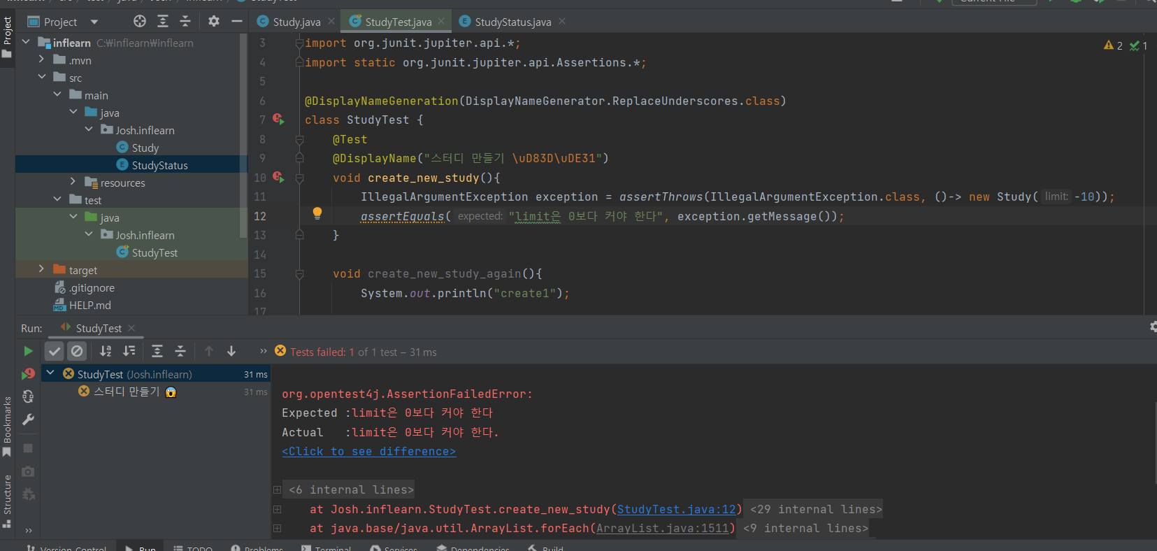 다음 코드를 보면 exception(IllegalArgumentException)이라는 변수에 assertThrows(A, B)에서 나오는 오류 값을 저장하고 assertEquals(a,b)로 a의 문자열과 b (exception의 오류메세지 = assertThrows()에서 나온 오류메세지)를 비교하고있다. Study.java에서, assertThrows(A,B)에서 B의 오류를 A(=IllegalArgumentException)와 일치시켰지만 B의 오류 메세지를 a와 살짝 다르게 하여( . 을 빼고 적음) 오류를 발생시켰고 그 결과는 위의 결과 값과 같다.