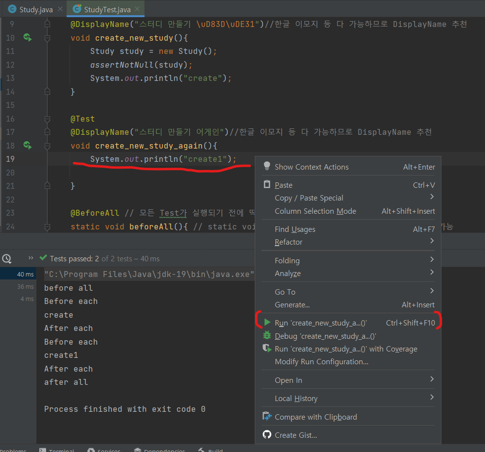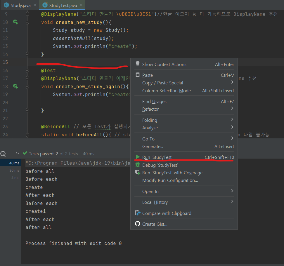 다음과 같이 19번째 줄(Test 내부)에서 우클릭 후 빨간 괄호 안에 Run을 실행하면 해당 Test만 실행이 된다.