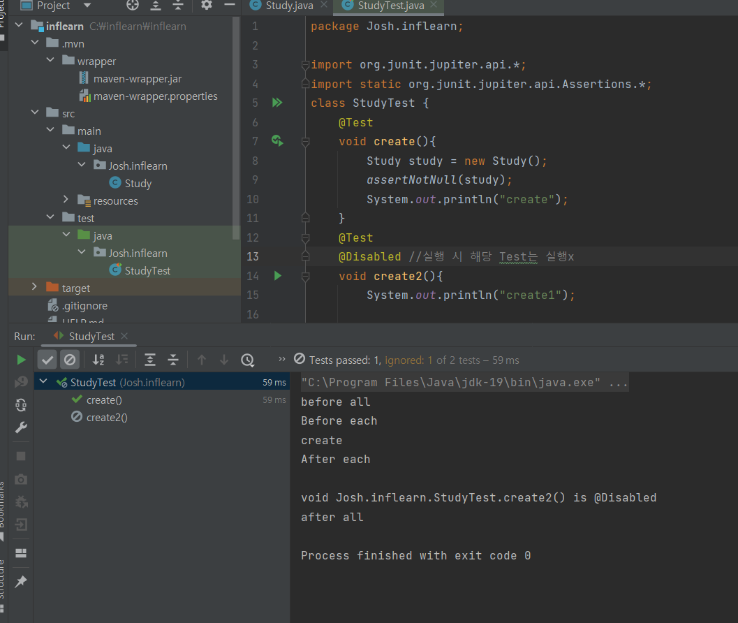 이전 코드와 같은 상황에서 두 번째 @Test 밑에 @Disabled를 적었더니 실행결과 creat2 메소드가 실행되지 않았다.