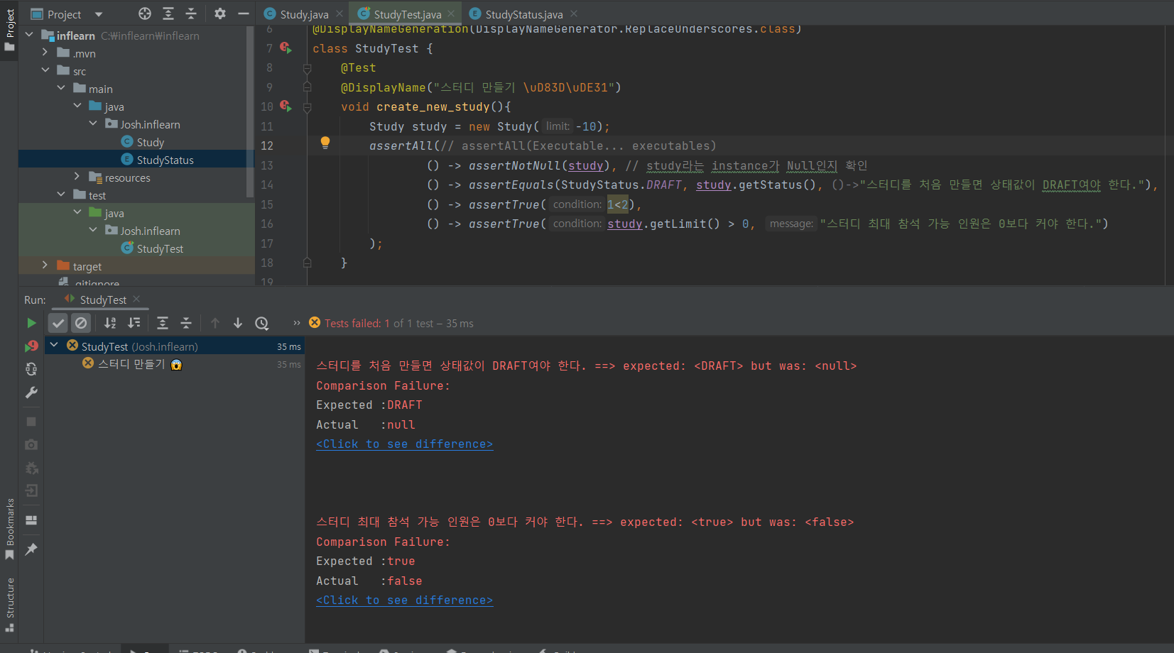 프로젝트에서 inflearn > src > main > java > Josh.inflearn 에 Study 클래스를 만들고 'ctrl + shift + t' 로 test 클래스를 만들면 새로운 test 클래스가 생긴다. 작업은 이곳에서 이루어진다.