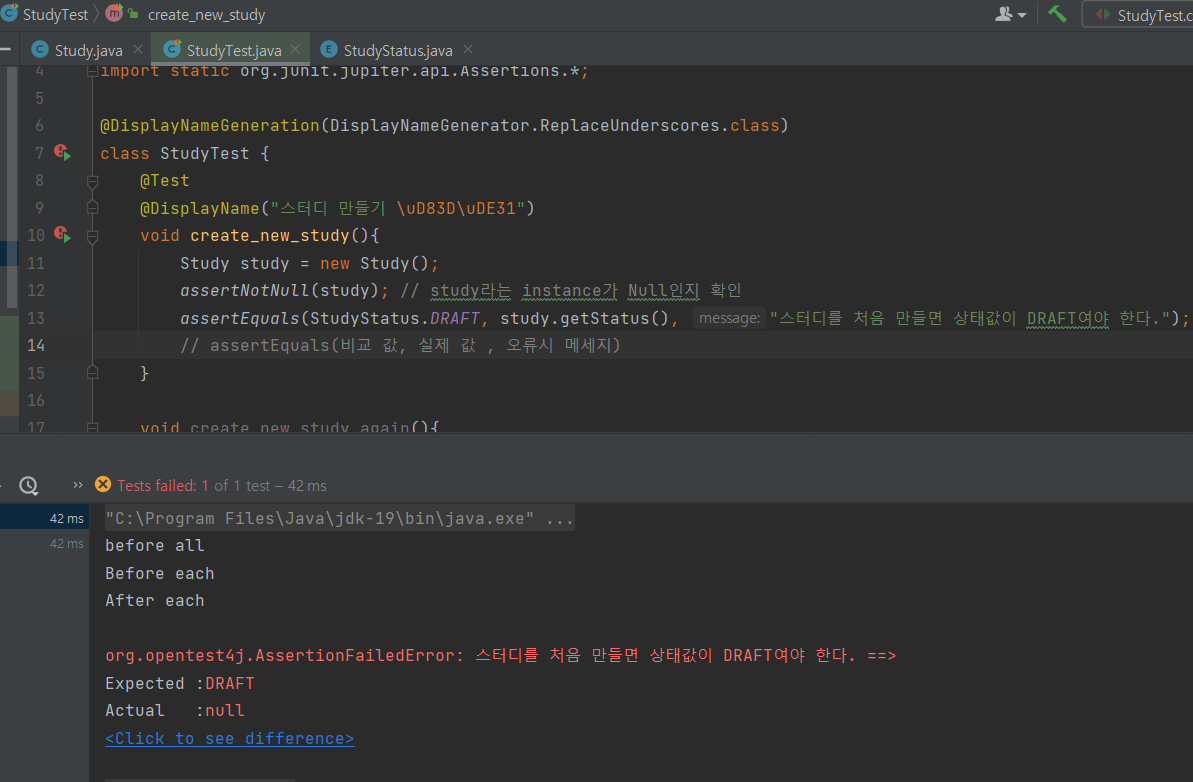 다음은 assertEquals()에서 오류가 난 경우이다. 기대 값이 DRAFT인데 실제 값이 Null이라 오류가 난 것을 밑의 오류 내용에서 알 수 있고 C값인 오류메세지가 출력된 것도 알 수 있다.