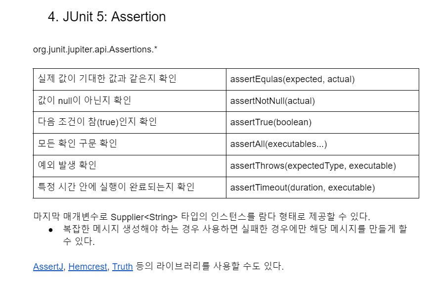 위의 Assertion 이외의 여러 라이브러리가 존재하지만 일단은 이정도의 기본 내용만 알고 가자.(AssertJ, Hemcrest, Truth 등)